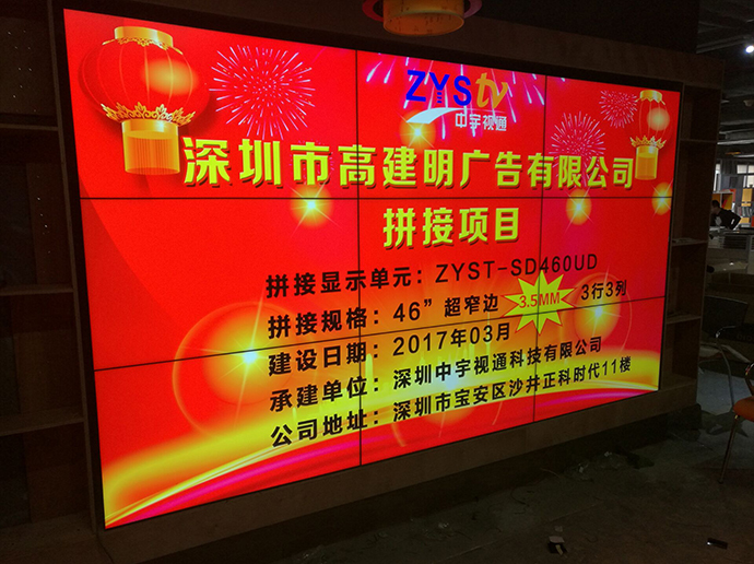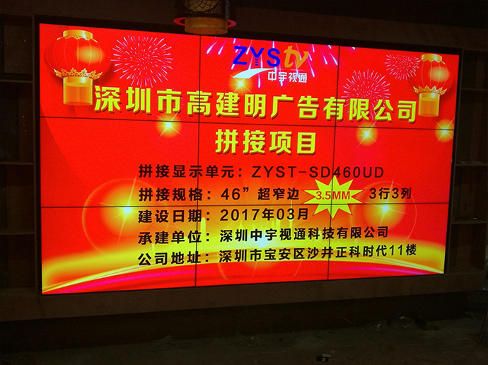 拼接項(xiàng)目:深圳市高建明廣告有限公司拼接單元:ZYST-SD460UD拼接拼縫:3.5mm拼接規(guī)格:3*3拼接尺寸:46寸拼接屏安裝方式:壁掛承建地址:深圳市高建明廣告有限公司承建日期:2017年3月承建單位:深圳中宇視通科技有限公司