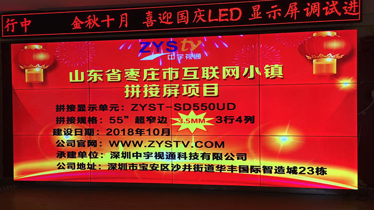 山東棗莊市互聯(lián)網(wǎng)小鎮(zhèn)55寸超窄邊3.5mm3行4列液晶拼接屏項(xiàng)目,安裝調(diào)試完成并且順利驗(yàn)收,中宇視通科技全體職工從深圳發(fā)來賀電!